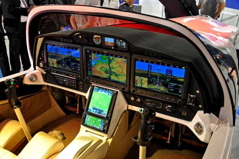 La aviónica es Garmin G3X touch compuesto por tres pantallas de alta resolución XWGA táctil de 10,6 Pulgadas (26,9 cm), cada piloto dispone de un PFD (Primary Flight Display) y en el centro de ubica un MFD (Multi Function Display). Los mismos disponen de una ranura para tarjetas SD mediante las cuales se puede actualizar fácilmente las bases de datos y el software. Cuenta con un sistema de visión sintética (SVX). Este paquete de aviónica entre otras cosas es capaz de mostrar las funciones EFIS (Electronic Flight Instrument System), moving map, WAAS GPS (Wide Area Augmentation System/Global Positioning System), obstáculos del terreno y EIS (Engine Indication System), también es capaz de incorporar transponder, comunicaciones e intercom. En un pequeño pedestal bajo el MFD se encuentran los que parecen ser un Garmin GTN-750 y un GTN 650 que son dos MFDs con pantallas táctiles, el primero de 6,9 Pulgadas (17,5 cm) y el segundo de 2, 64 Pulgadas (6,6 cm), desde donde se puede acceder, entre otros datos, a información GPS/NAV/COMM.